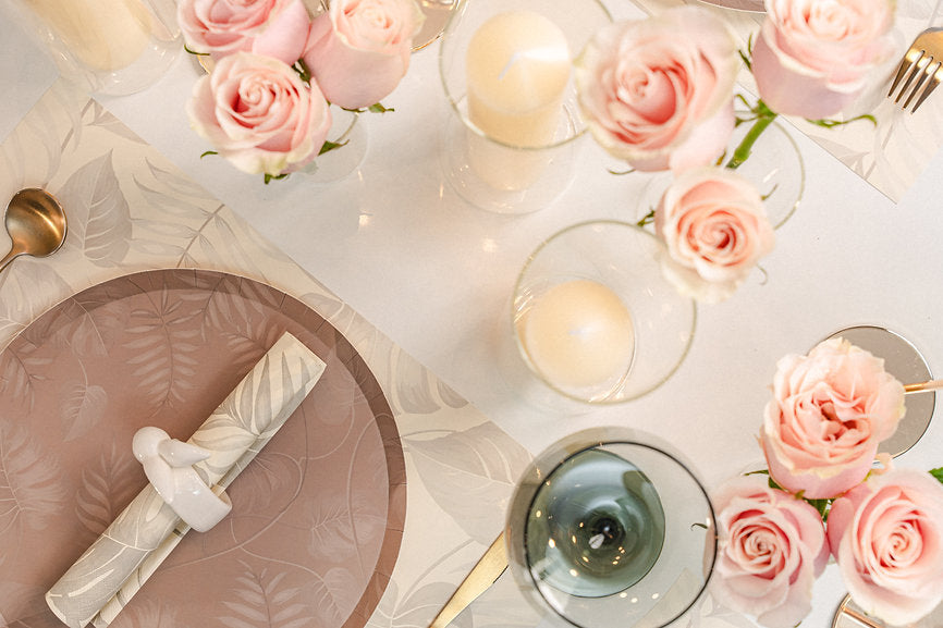 Full sets, featuring coordinated disposable plates, napkins, and placemats for a chic, effortless table setting at any celebration!